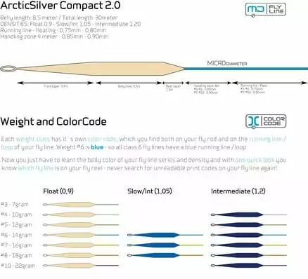 «Compact 2.0» er en videreutvikling og forbedring av den første Compact-serien til Arctic Silver som i ulike tester ble kåret til «Best of the Best» (også av «Skitt Fiske»). Profilen er delvis endret, vekta er redusert med ½ gram, coatingkvaliteten er forbedret og i tillegg har vi utstyrt disse linene med en 4 meter lang «Handling Zone» mellom Baktaperingen og Skytelina. «Handling Zone»-delen, som er 0,10 mm tykkere enn Skytelina, blir en slags forlengelse av baktaperingen som både balanserer opp hodet for bedre kontroll og medfører at du kan holde mer line i lufta før skyting. I tillegg beskyttes linas mest sårbare deler mot friksjonsslitasje.