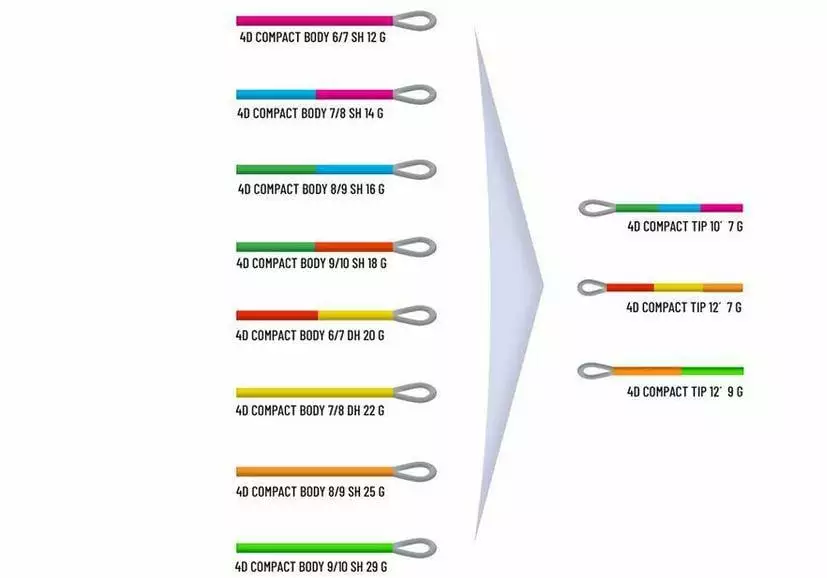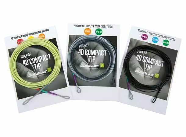 Guideline 4D Compact Tipper er laget for bruk med våre 4D Compact klumper (bodies). Men, de fungerer også utmerket til andre typer klumper og bakdeler av ulike vekter og fabrikater. I likhet med øvrige 4D tipper, har de en utmerket overrulling og kraft takket være sin unike design og nedtappering. Alle synkende varianter har dobbeldensitet for å sikre en rett og effektiv synkende linje i vannet. Guideline 4D Compact Tips har enestående overrulling når de kombineres med riktig type bakdel og lengde på fortommen.